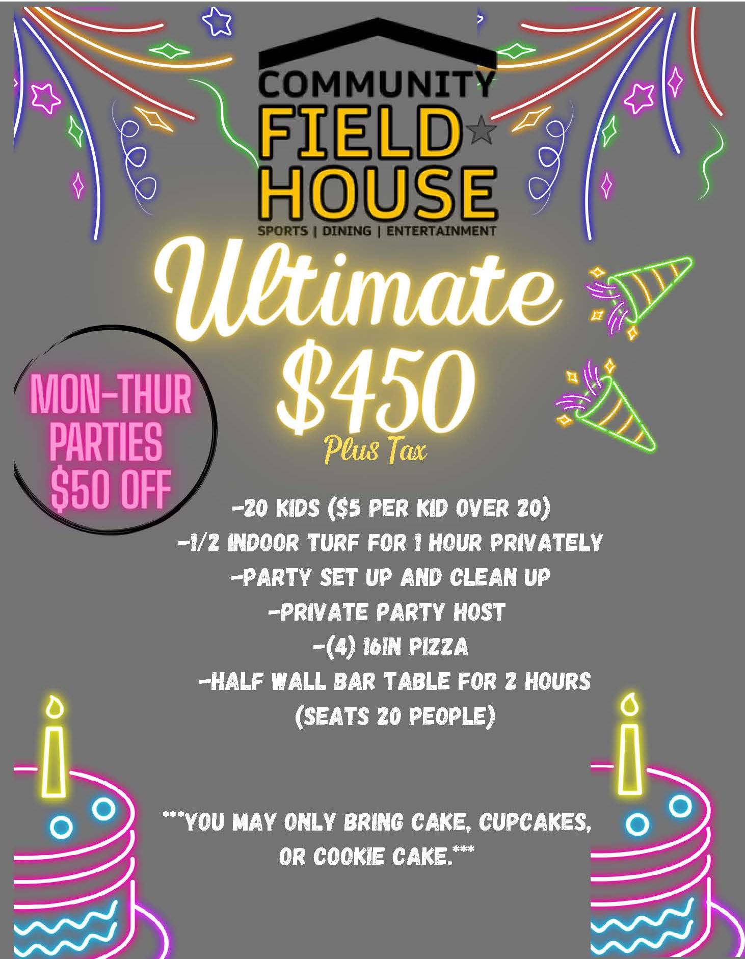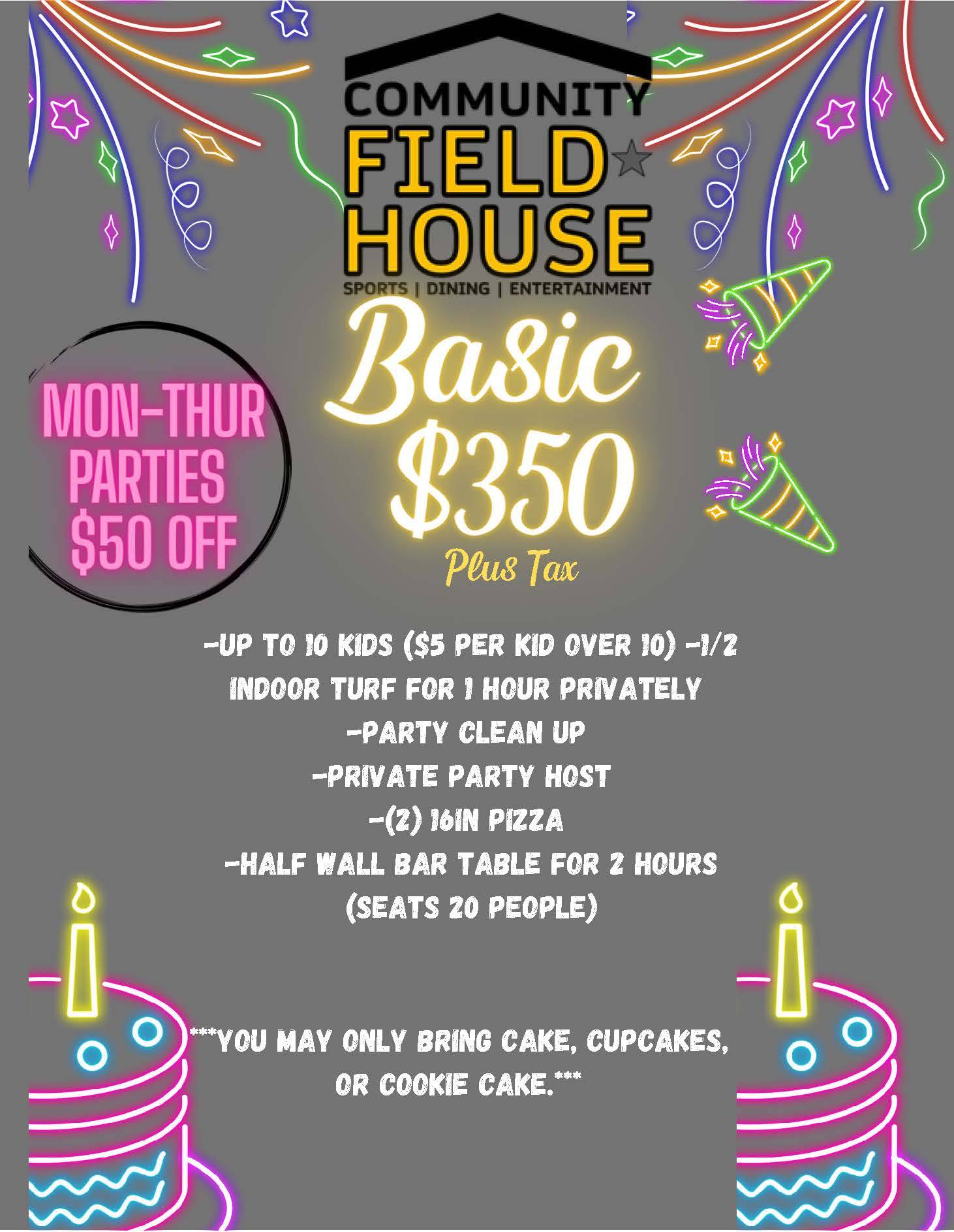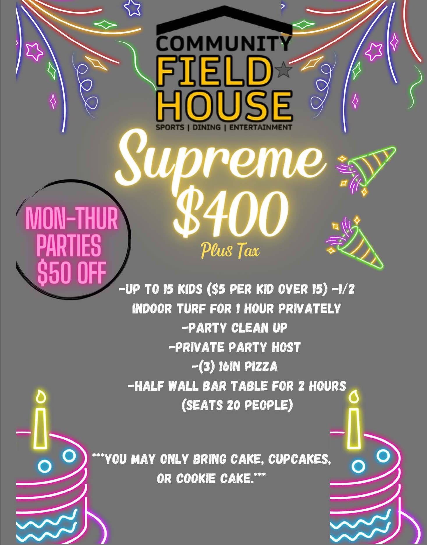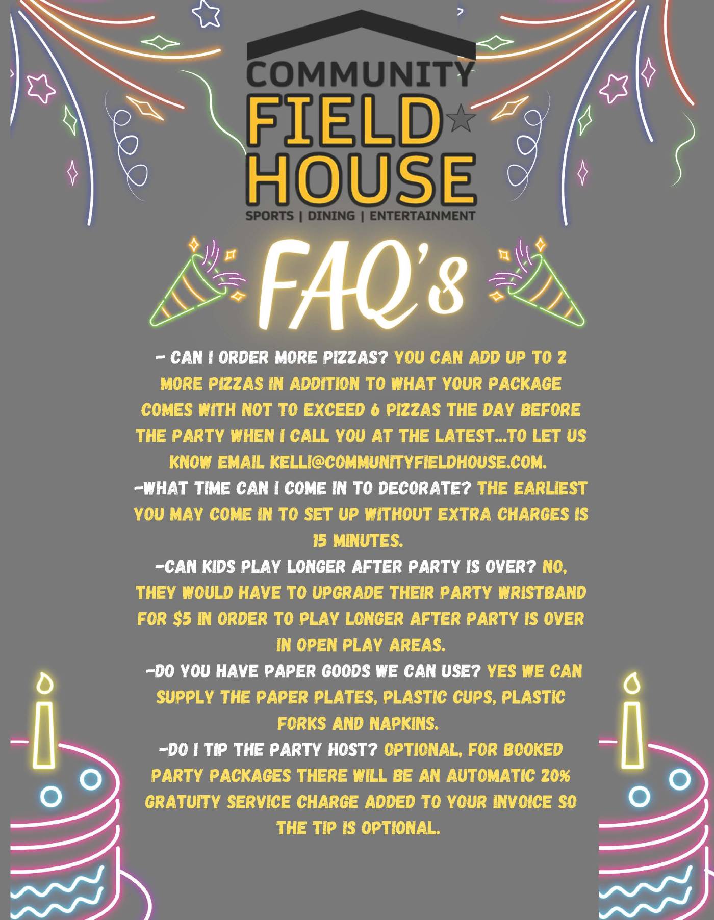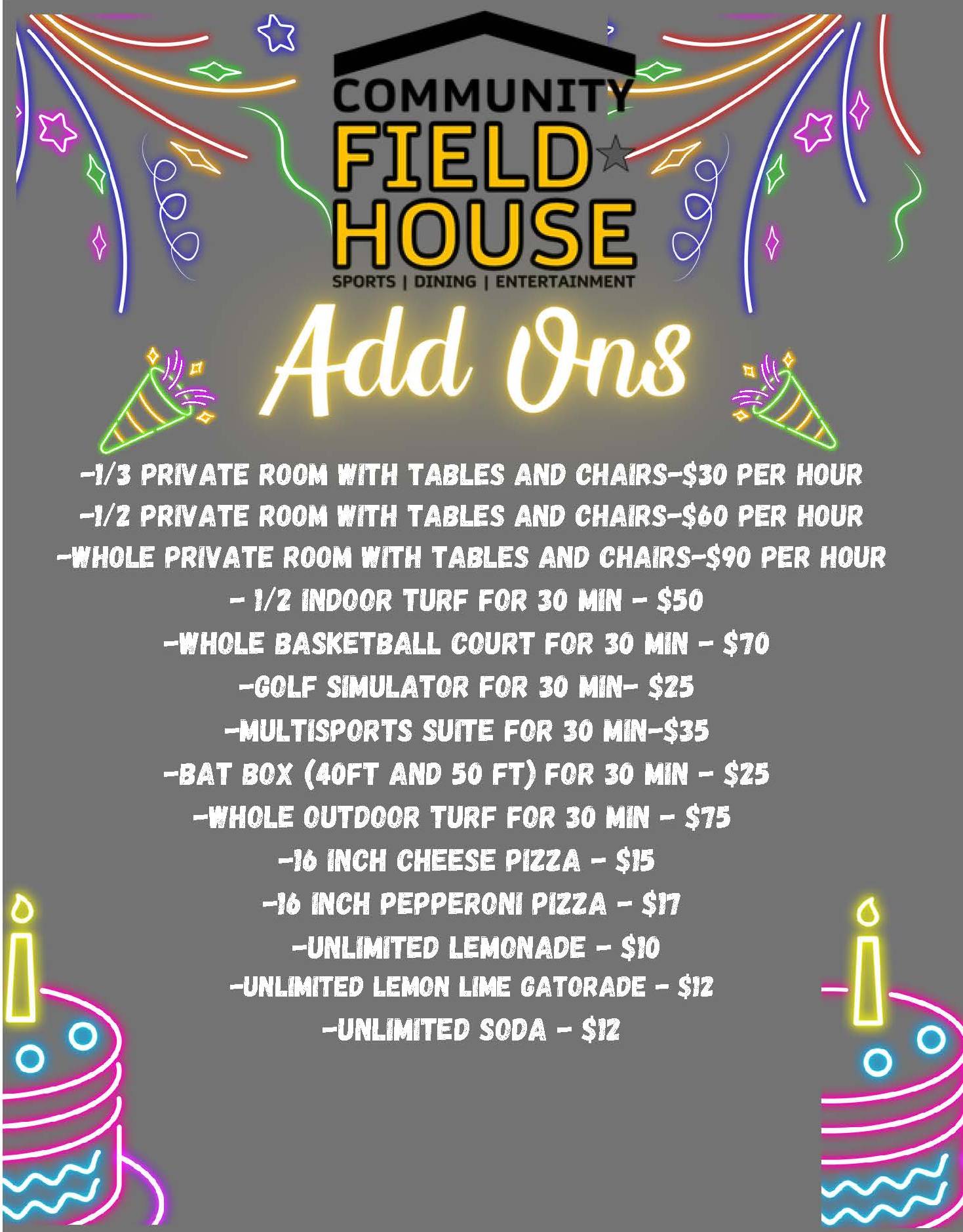 Please contact us if you have a party of 15 or more at Susanne@communityfieldhouse.com